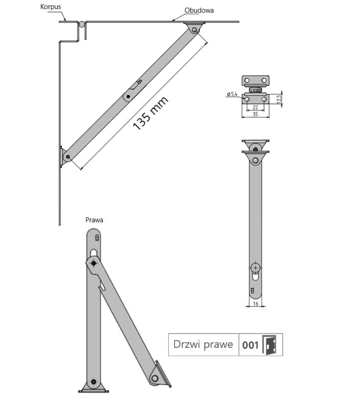 Stalowa podpórka do drzwiczek, ocynkowana o wymiarach 16×135 mm. Świetnie sprawdzi się w obudowach maszyn i lekkich drzwiczkach. Blokada nie nadaje się do standardowych drzwi domowych. Blokada do drzwi prawych.