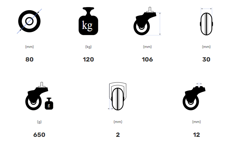 Poliamidowe koło obrotowe o średnicy 80mm, maksymalnym obciążeniu 120kg i obudowie wykonanej ze stali. Mocowanie za pomocą otworu 12mm. Posiada zamontowany hamulec.