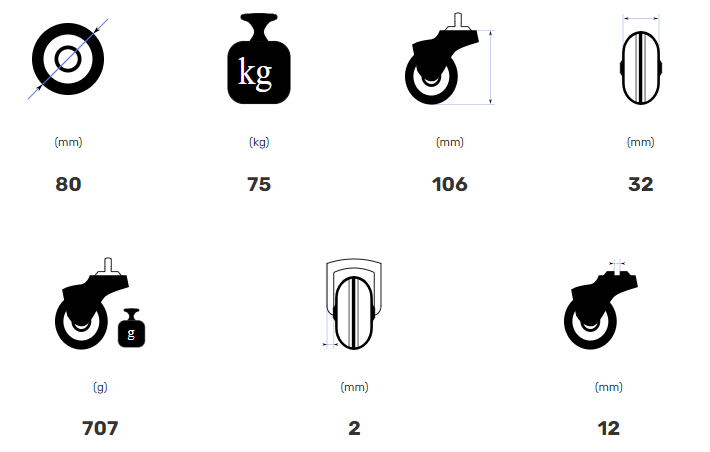 Polipropylenowe koło obrotowe z bieżnikiem z gumy termoplastycznej. Średnica wynosi 80mm, max. obciążenie to 75kg, obudowa ze stali. Mocowanie za pomocą otworu 12mm. Z zamontowanym hamulcem.