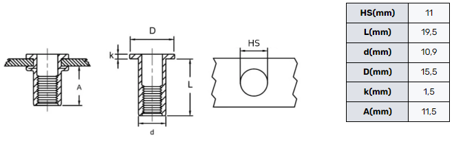 Zestaw 50 sztuk stalowej nitonakrętki o płaskim łbie i gwincie M8x1,25mm. Nitonakrętka o cylindrycznym kształcie, zakresie chwytania 3,5-5mm, wersja wydłużona.