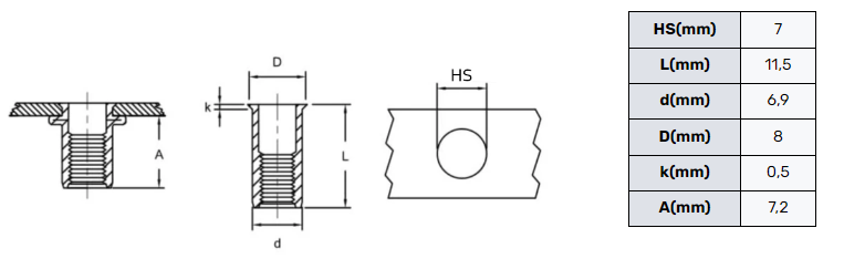 Zestaw 50 sztuk nitonakrętki ze stali nierdzewnej o gwincie M5x0,8 mm. Nitonakrętka o cylindrycznym kształcie, zakresie chwytania 0,5-2,0 mm.
