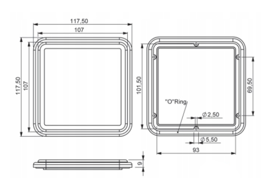 Przeźroczyste okienko o wymiarach 117,5 mm na 117,5 mm, umożliwiające podgląd bez konieczności otwierania obudowy.