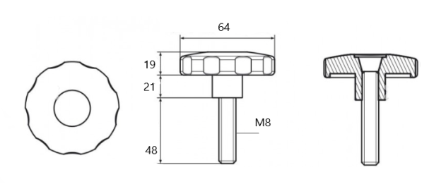 Poliamidowe pokrętło o wzmocnionej konstrukcji. Średnica uchwytu wynosi 64mm, zakończone stalową, ocynkowaną śrubą o gwincie M8 i długości 48mm.