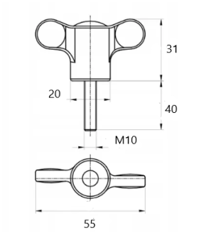 Poliamidowe pokrętło w kształcie motylka, zakończone stalową, ocynkowaną śrubą o gwincie M10 i długości 40 mm. Długość uchwytu wynosi 55 mm.