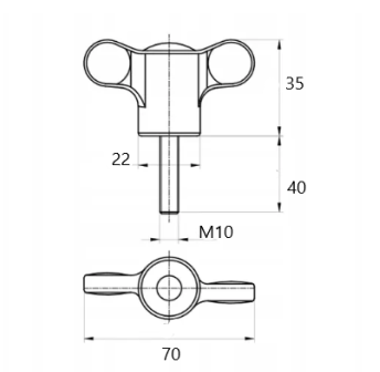 Poliamidowe pokrętło w kształcie motylka, zakończone stalową, ocynkowaną śrubą o gwincie M10 i długości 40 mm. Długość uchwytu wynosi 70 mm.