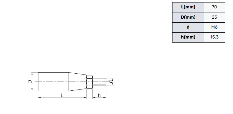 Poliamidowa rękojeść obrotowa o długości 70mm i średnicy 25mm. Zakończona śrubą M6 o długości 15,3mm.