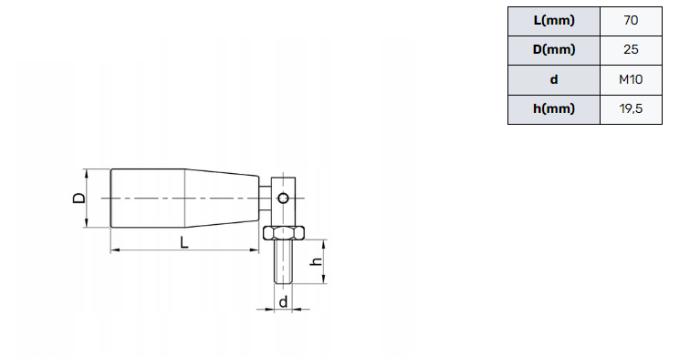 Poliamidowa, składana rękojeść obrotowa o długości 70mm i średnicy 25mm. Zakończona śrubą M10 o długości 19,5mm.