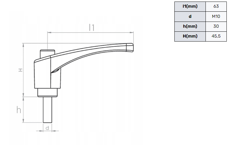 Poliamidowa rękojeść zaciskowa o długości uchwytu 63mm. Dźwignia w kolorze czarnym, zakończona śrubą o gwincie M10 i długości 30mm.