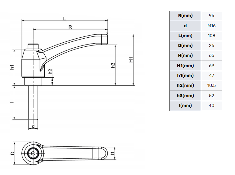 Metalowa rękojeść zaciskowa w kolorze pomarańczowym o długości uchwytu 95 mm zakończona śrubą o gwincie M16 i długości 40 mm.