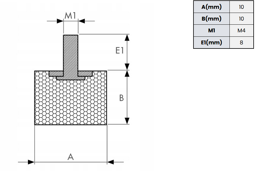 Gumowy izolatorowy o wymiarach 10x10mm, zakończony z jednej strony śrubą o gwincie M4 i długości 8mm.