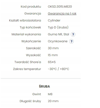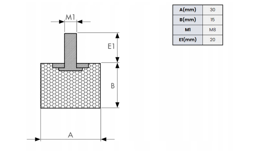 Gumowy wibroizolator o wymiarach 30x15mm, zakończony z jednej strony śrubą o gwincie M8 i długości 20mm.