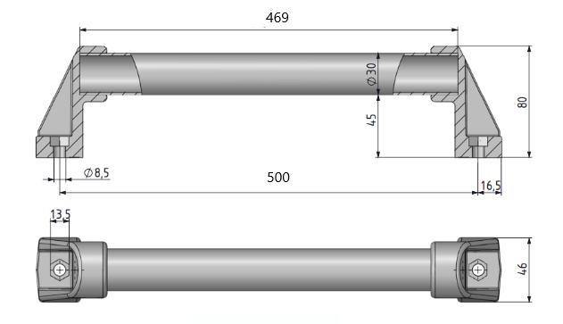 Uchwyt ze stalowej rurki powlekanej tworzywem sztucznym umieszczony na dwóch poliamidowych częściach bocznych, o rozstawie otworów 500mm. Średnica otworów wynosi 8,5mm. Długością uchwytu można manipulować poprzez ucięcie rurki.