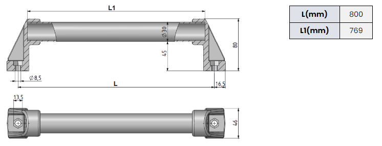 Uchwyt ze stalowej rurki powlekanej polietylenem umieszczony na dwóch poliamidowych częściach bocznych, o rozstawie otworów 800mm. Średnica otworów wynosi 8,5mm.