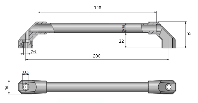 Aluminiowy, okrągły uchwyt umieszczony na dwóch poliamidowych częściach bocznych, o rozstawie otworów 200mm. Otwory mają średnicę 9mm. Długością uchwytu można manipulować poprzez ucięcie rurki.
