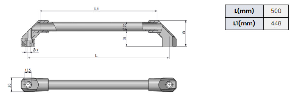 Aluminiowy, okrągły uchwyt umieszczony na dwóch poliamidowych częściach bocznych, o rozstawie otworów 500mm. Otwory mają średnicę 9mm. Długością uchwytu można manipulować poprzez ucięcie rurki.