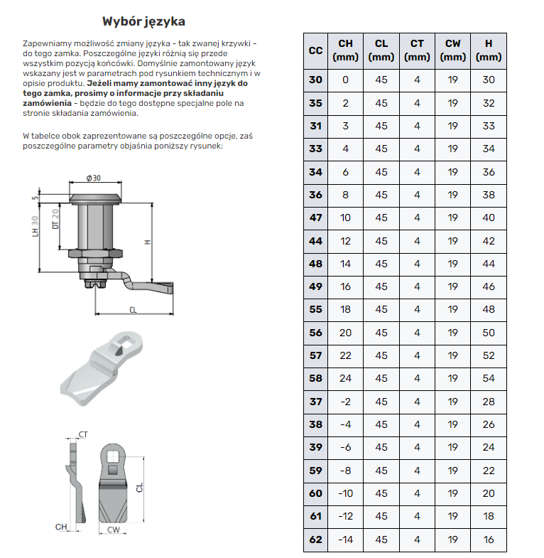 Domyślnie zamontowany jest język płaski (CC-30), ale zapewniamy możliwość jego zmiany. Lista opcji umieszczona są pod rysunkiem technicznym.