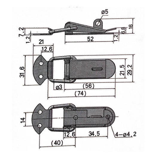 Stalowy zatrzask kolankowy o wymiarach 74×29,2mm. Niklowany, mocowany otworami, ze sprężyną utrzymującą w pozycji zamkniętej. Sprzedawany z uchwytem, posiada uchwyt na kłódkę.