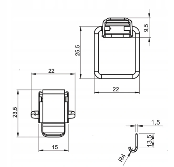 Zatrzask kolankowy ze stali nierdzewnej, o wymiarach 23,5x22mm, zapinany na krótki uchwyt.