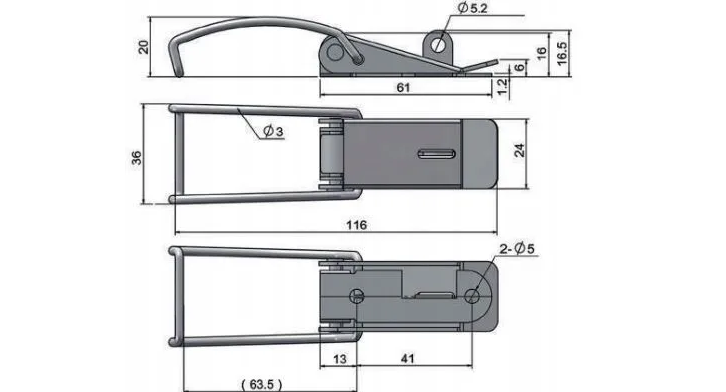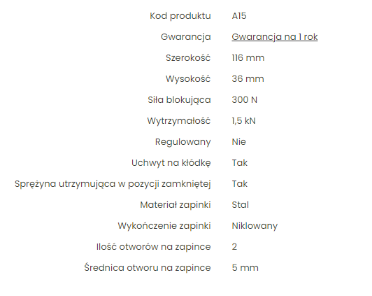 Stalowy zatrzask kolankowy o wymiarach 116x36mm. Niklowany, mocowany otworami. Zapinany na kłódkę, ze sprężyną utrzymującą w pozycji zamkniętej.