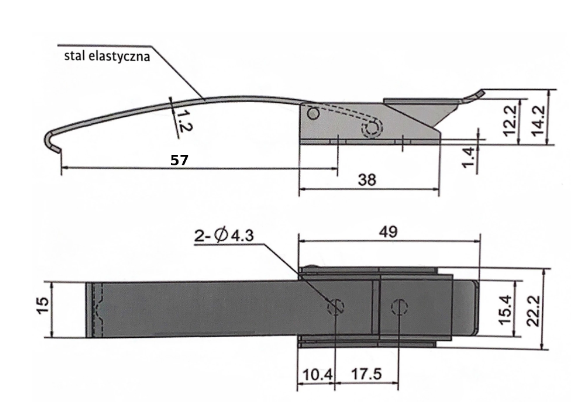 Zatrzask kolankowy ze stali nierdzewnej o wymiarach 99×22,2mm. Mocowany za pomocą otworów.