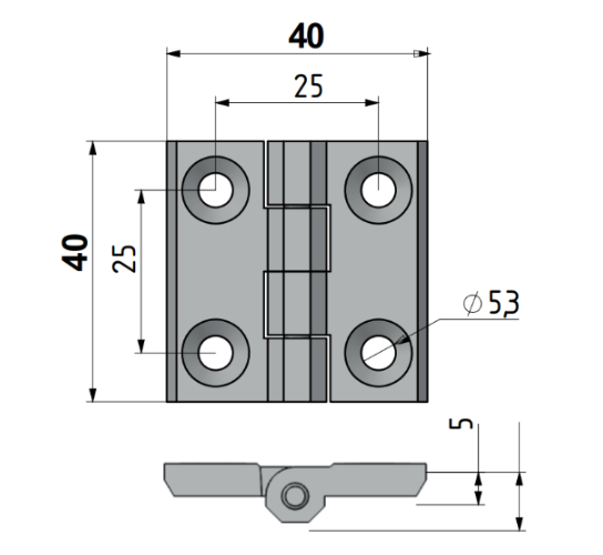 Płaski zawias przemysłowy o wymiarach 40x40mm. Wykonany ze stali nierdzewnej. Mocowany za pomocą czterech otworów ⌀5mm. Maksymalny kąt rozwarcia zawiasu to 270°. Nadaje się zarówno do drzwi prawych jak i lewych.