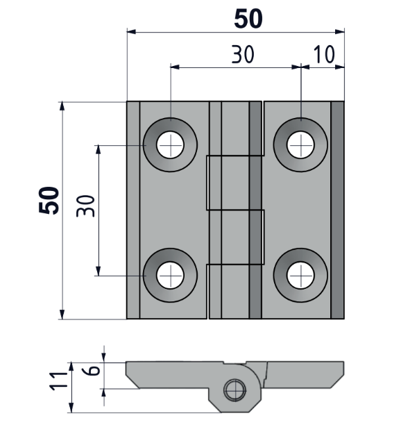 Płaski zawias przemysłowy o wymiarach 50x50mm. Wykonany z chromowanego znalu, mocowany za pomocą czterech otworów ⌀6mm. Maksymalny kąt rozwarcia zawiasu to 270°. Nadaje się zarówno do drzwi prawych jak i lewych.