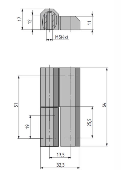 Płaski zawias przemysłowy o wymiarach 50x64mm, podnoszony. Wykonany z chromowanego znalu, mocowany za pomocą czterech otworów ⌀5mm ukrytych z zewnątrz. Maksymalny kąt rozwarcia zawiasu to 180°. Nadaje się do drzwi prawych.