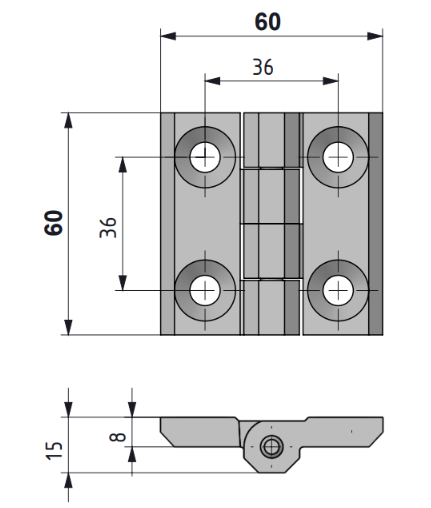 Płaski zawias przemysłowy o wymiarach 60x60mm. Wykonany ze znalu, lakierowany proszkowo na czarno. Mocowany za pomocą czterech otworów ⌀8mm. Maksymalny kąt rozwarcia zawiasu to 270°. Nadaje się do drzwi prawych jak i lewych.
