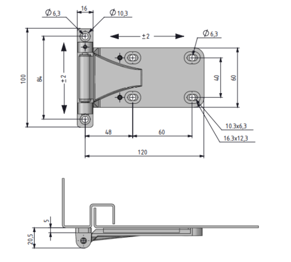 Płaski zawias przemysłowy o wymiarach 120x100mm. Wykonany ze znalu, lakierowany proszkowo na czarno. Mocowany za pomocą sześciu otworów ⌀6,3 mm. Maksymalny kąt rozwarcia zawiasu to 180°. Nadaje się do drzwi lewych.