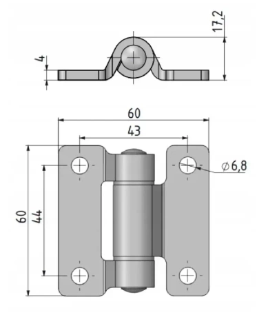 Płaski zawias przemysłowy o wymiarach 60x60mm. Wykonany ze stali polakierowanej na czarno, mocowany za pomocą czterech otworów ⌀6,8mm. Maksymalny kąt rozwarcia zawiasu to 180°. Nadaje się zarówno do drzwi prawych jak i lewych.